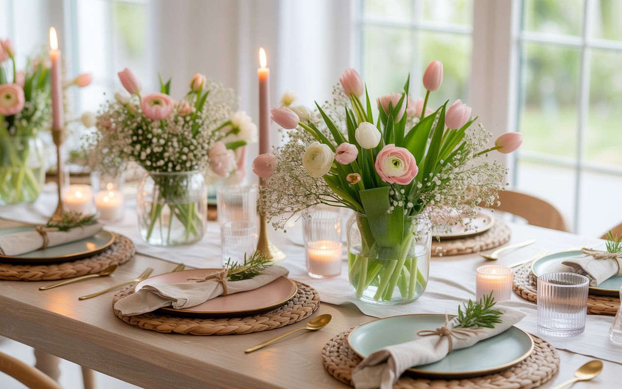 Nothing says spring quite like a vibrant floral centerpiece. Use seasonal flowers like tulips, daffodils, or peonies in a simple vase. You can choose a single type of flower for a clean look or mix different blooms for a more eclectic feel. Place the arrangement in the center of your table, allowing it to be the focal point of your spring setting. Floral centerpieces instantly brighten the mood and bring a sense of freshness into your home. They can elevate any table setting, making it feel special. For an easy tip, consider adding fresh herbs like mint or basil to your arrangement for a delightful scent and a touch of greenery.